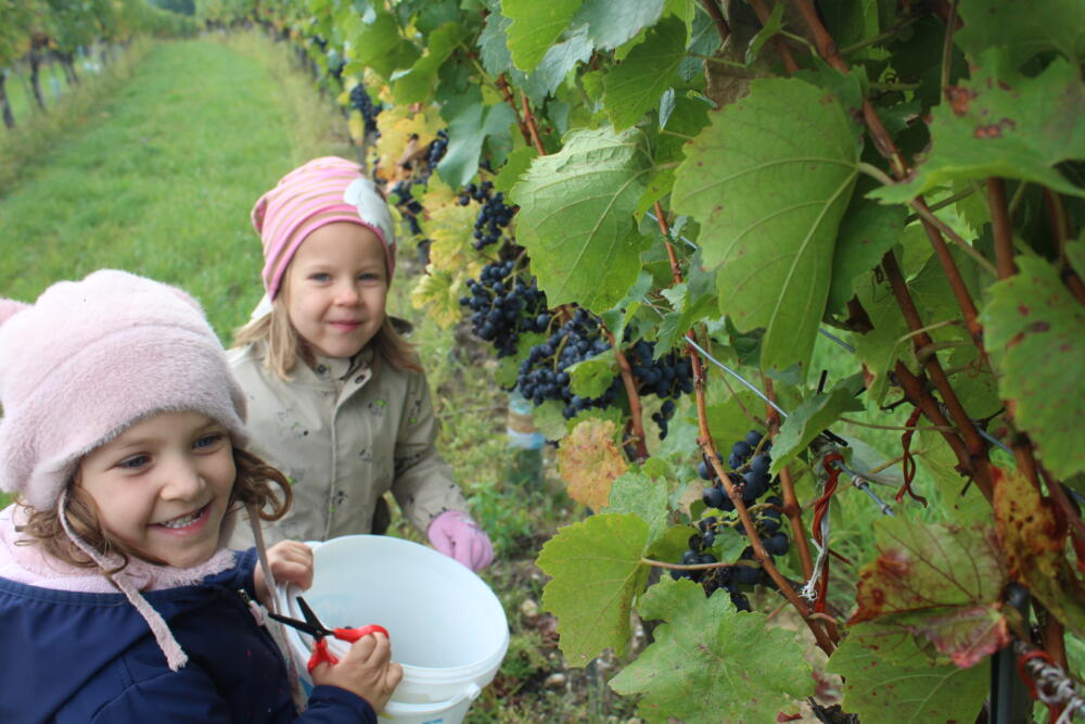 Die superschlauen Forscherkids machten sich mit dem Autobus auf den Weg zur Weinlese nach Neckenmarkt. Bei der Donatuskapelle, im Weingarten unserer Anna, durften die Kinder mit kleinen Kinderscheren selbst Weintrauben ernten. Fleißig wurden die Trauben in kleine Kübel gesammelt. Anschließend ging es ans Pressen: Mit einer kleinen Saftpresse wurden die Trauben zerstampft und zu leckeren Traubensaft gepresst. Der frische Saft wurde in kleine Flaschen abgefüllt – und jedes Kind durfte eine Flasche Traubensaft mit nach Hause nehmen. Nach der Weinlese spazierten wir noch durch den Weingarten, spielten Fang- und Laufspiele und genossen noch eine leckere Jause. Danach ging es zurück in den Kindergarten.